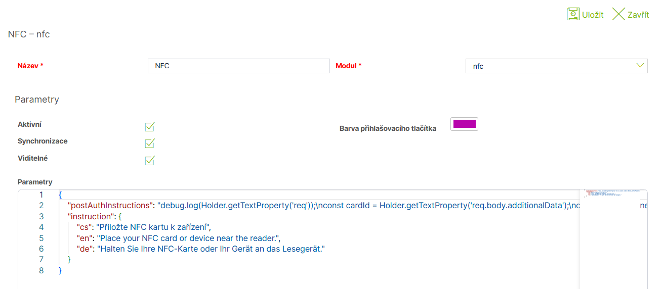 {"postAuthInstructions":"debug.log(Holder.getTextProperty('req'));\nconst cardId = Holder.getTextProperty('req.body.additionalData');\nconst cardIdCleaned = cardId.replaceAll('\"', '');\ndebug.log(cardIdCleaned);\nconst userId = dt.from('NFCtest').whereIndex(cardIdCleaned,'=').getFirst().COL_1;\ndebug.log(userId)\nreturn identity.findUser(userId);","instruction":{"cs":"Přiložte NFC kartu k zařízení","en":"Place your NFC card or device near the reader.","de":"Halten Sie Ihre NFC-Karte oder Ihr Gerät an das Lesegerät."}}Popis jednotlivých částí konfigurace: